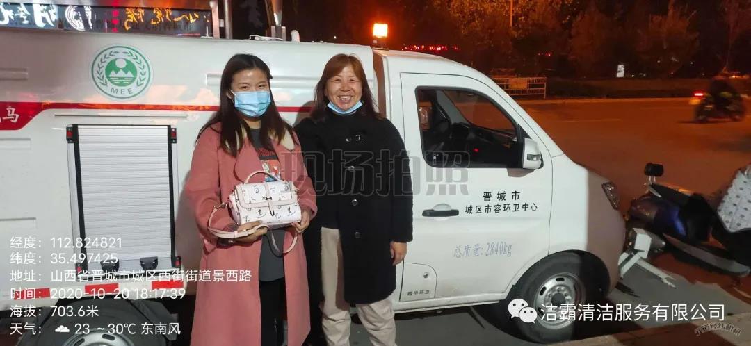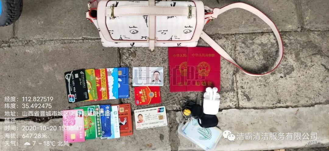 10月20日下午3點左右,晉城市潔霸清潔服務(wù)股份有限公司保潔部環(huán)衛(wèi)經(jīng)理李通和工人在城區(qū)南街街道景西路段進行街道清洗作業(yè)時,忽然看見晉城農(nóng)商銀行門前的綠化帶里有一個女士挎包,忙叫環(huán)衛(wèi)工人郭志云把挎包撿了起來。當時就考慮到失主丟失挎包以后一定很著急,在同事的共同見證下他們打開挎包,經(jīng)過查看,發(fā)現(xiàn)挎包內(nèi)有一張王女士的身份證、社?般y行卡數(shù)張,還有結(jié)婚證、鑰匙、耳機、富士康工牌等物品。憑借富士康工牌上的工號,他們給富士康打電話聯(lián)系到了失主,后由環(huán)衛(wèi)主管秦彩鳳將挎包交到失主手中。收到失而復(fù)得的挎包,王女士又驚又喜,感激萬分。