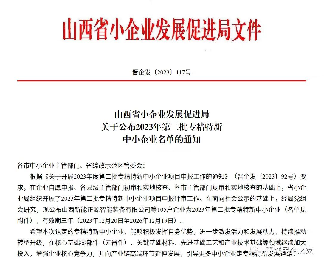 近日,山西省小企業(yè)發(fā)展促進局公布了2023年第二批專精特新中小企業(yè)名單(全省共105家,其中晉城市9家),我公司成功上榜。
