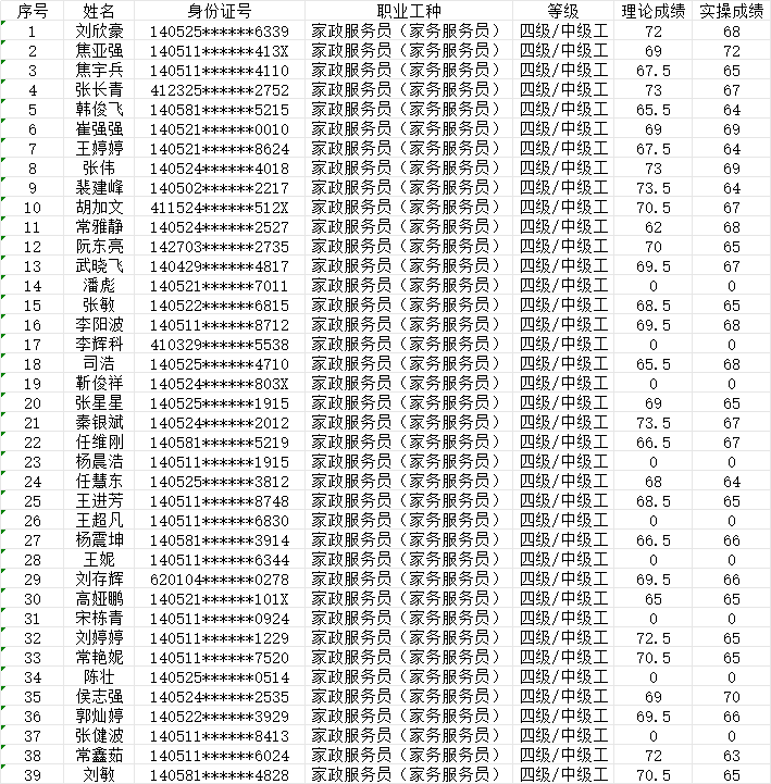 晉城市潔霸清潔服務(wù)股份有限公司職業(yè)技能等級(jí)認(rèn)定中心現(xiàn)將2024年1月28日認(rèn)定人員成績公示如下: