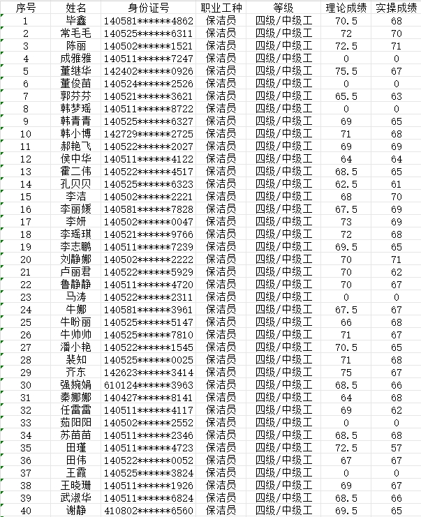 晉城市潔霸清潔服務(wù)股份有限公司職業(yè)技能等級認(rèn)定中心現(xiàn)將2024年2月4日認(rèn)定人員成績公示如下: