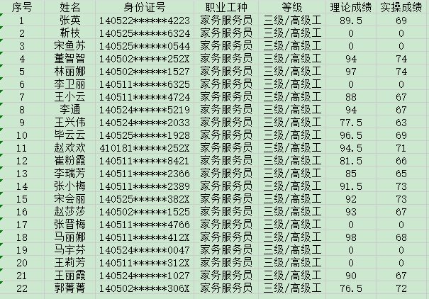 晉城市潔霸清潔服務(wù)股份有限公司職業(yè)技能等級(jí)認(rèn)定中心現(xiàn)將2024年4月28日認(rèn)定人員成績(jī)公示如下:
