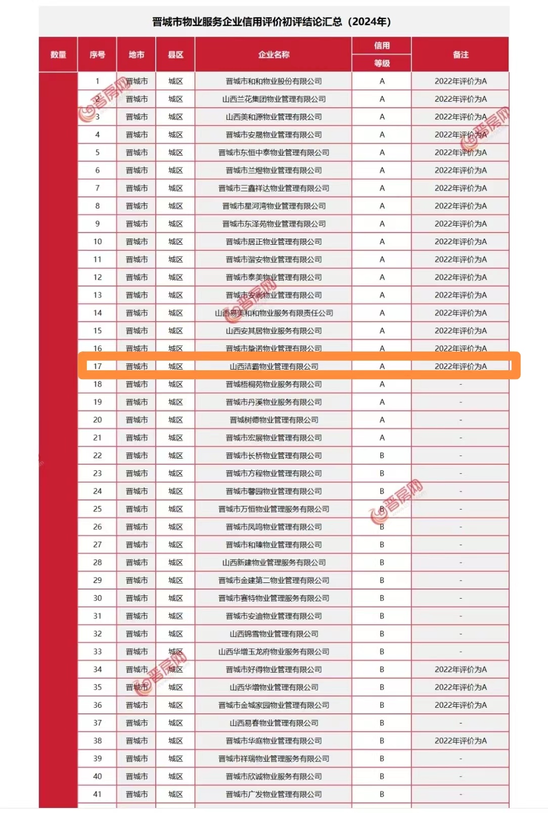 日前,山西省住房和城鄉(xiāng)建設廳發(fā)布了2023年度房地產企業(yè)信用評價結果的通知,根據(jù)通知顯示,晉城市共有200家物業(yè)服務公司參加評定,晉城市潔霸物業(yè)管理有限公司獲得2023年度物業(yè)服務企業(yè)信用等級A級認證。在本次考評結果中,潔霸物業(yè)光榮上榜,是對其物業(yè)服務品質的充分肯定。 |