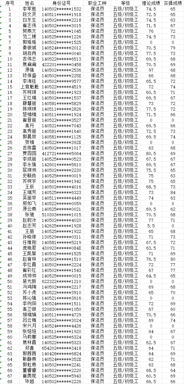 晉城市潔霸清潔服務(wù)股份有限公司職業(yè)技能等級認(rèn)定中心2024年7月7日第20批保潔員初級認(rèn)定人員成績公示