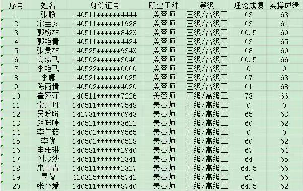 晉城市潔霸清潔服務(wù)股份有限公司職業(yè)技能等級認定中心2024年10月13日第12批美容師高級認定人員成績公示